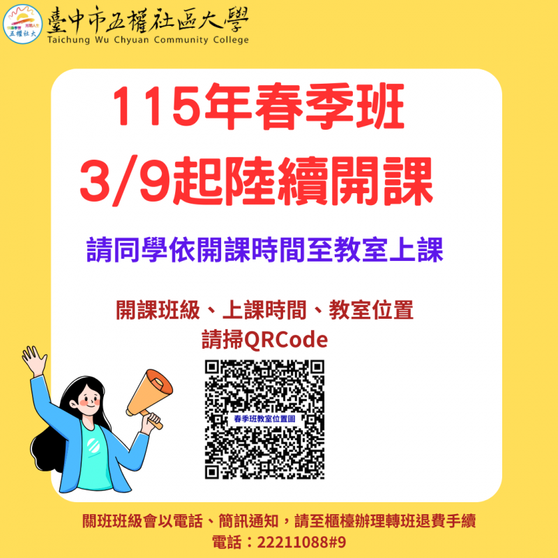 最新消息 : 115年春季班3月9日起陸續開課囉~~開課時間、教室位置請掃QRcode~